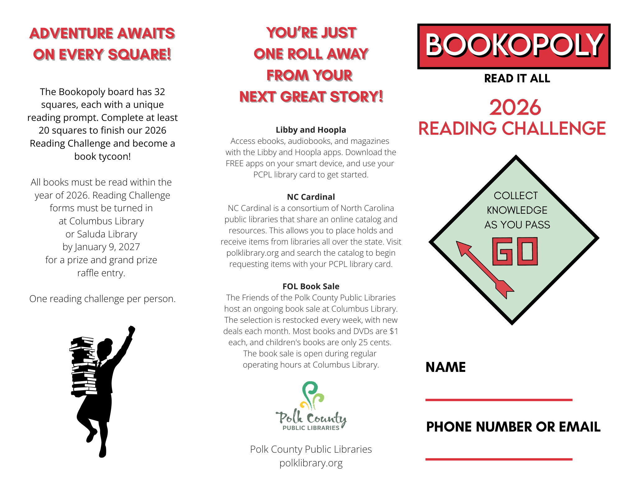 Reading Challenge forms must be turned in at Columbus Library or Saluda Library by January 9, 2027 for a prize and grand prize raffle entry.