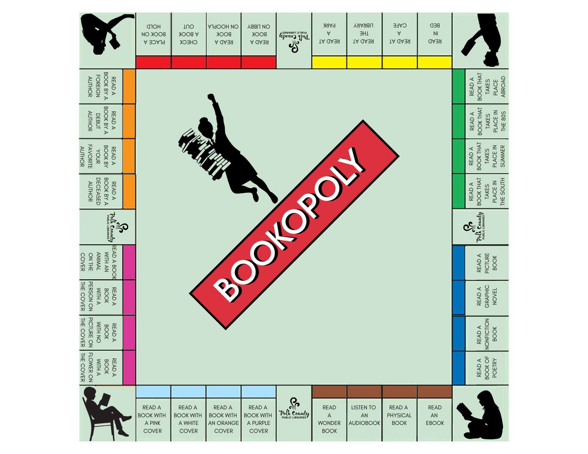 Pick up the Bookopoly 2026 Reading Challenge form at the library, or print the images below.