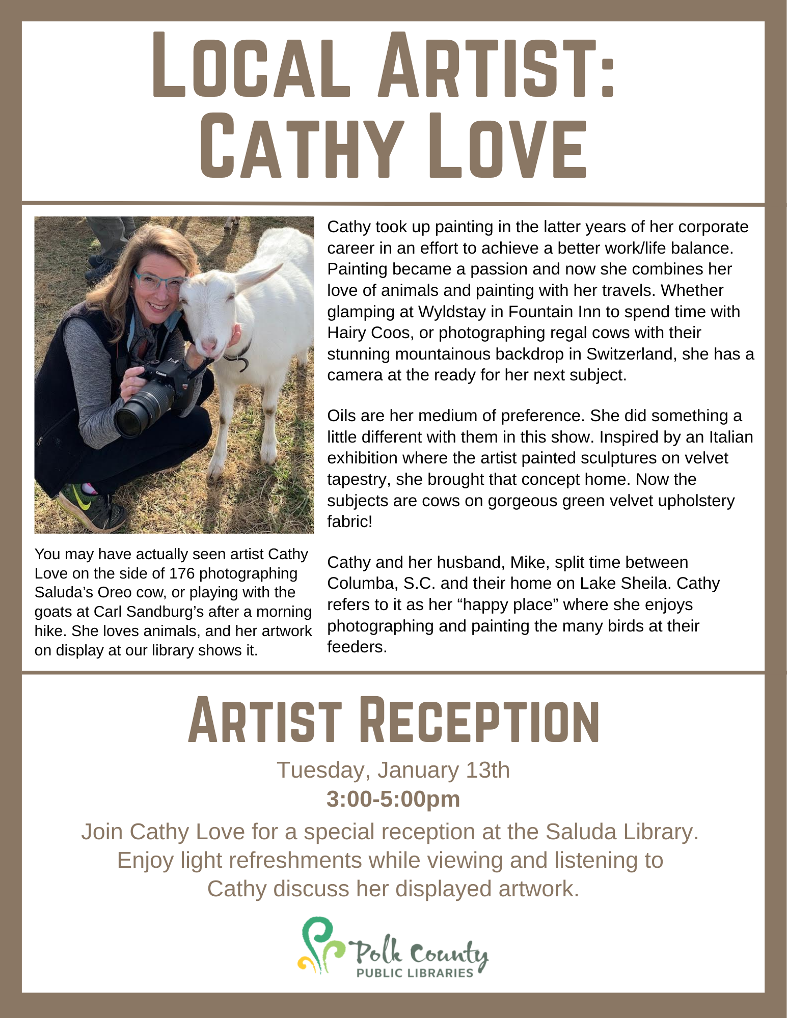 Cathy Love Artist Reception 01/13/2026 , 3:00 PM at PCPL Saluda Cathy Love Artist Reception Enjoy light refreshments while viewing and listening to Cathy discuss her displayed artwork. Cathy took up painting in the latter years of her corporate career in an effort to achieve a better work/life balance. Painting became a passion and now she combines her love of animals and painting with her travels. Whether glamping at Wyldstay in Fountain Inn to spend time with Hairy Coos, or photographing regal cows with their stunning mountainous backdrop in Switzerland, she has a camera at the ready for her next subject. Oils are her medium of preference. She did something a little different with them in this show. Inspired by an Italian exhibition where the artist painted sculptures on velvet tapestry, she brought that concept home. Now the subjects are cows on gorgeous green velvet upholstery fabric! Cathy and her husband, Mike, split time between Columba, S.C. and their home on Lake Sheila. Cathy refers to it as her "happy place" where she enjoys photographing and painting the many birds at their feeders. You may have actually seen Cathy on the side of 176 photographing Saluda's Oreo cow, or playing with the goats at Carl Sandburg's after a morning hike. She loves animals, and her artwork on display at the library shows it.