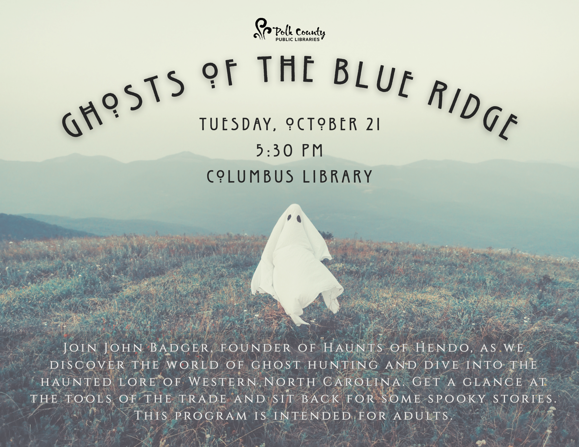 Ghosts of the Blue Ridge 10/21/2025 , 5:30 PM at PCPL Columbus Ghosts of the Blue Ridge Join John Badger, founder of Haunts of Hendo, as we discover the world of ghost hunting and dive into the haunted lore of Western North Carolina. Get a glance at the tools of the trade and sit back for some spooky stories. This program is intended for adults. |