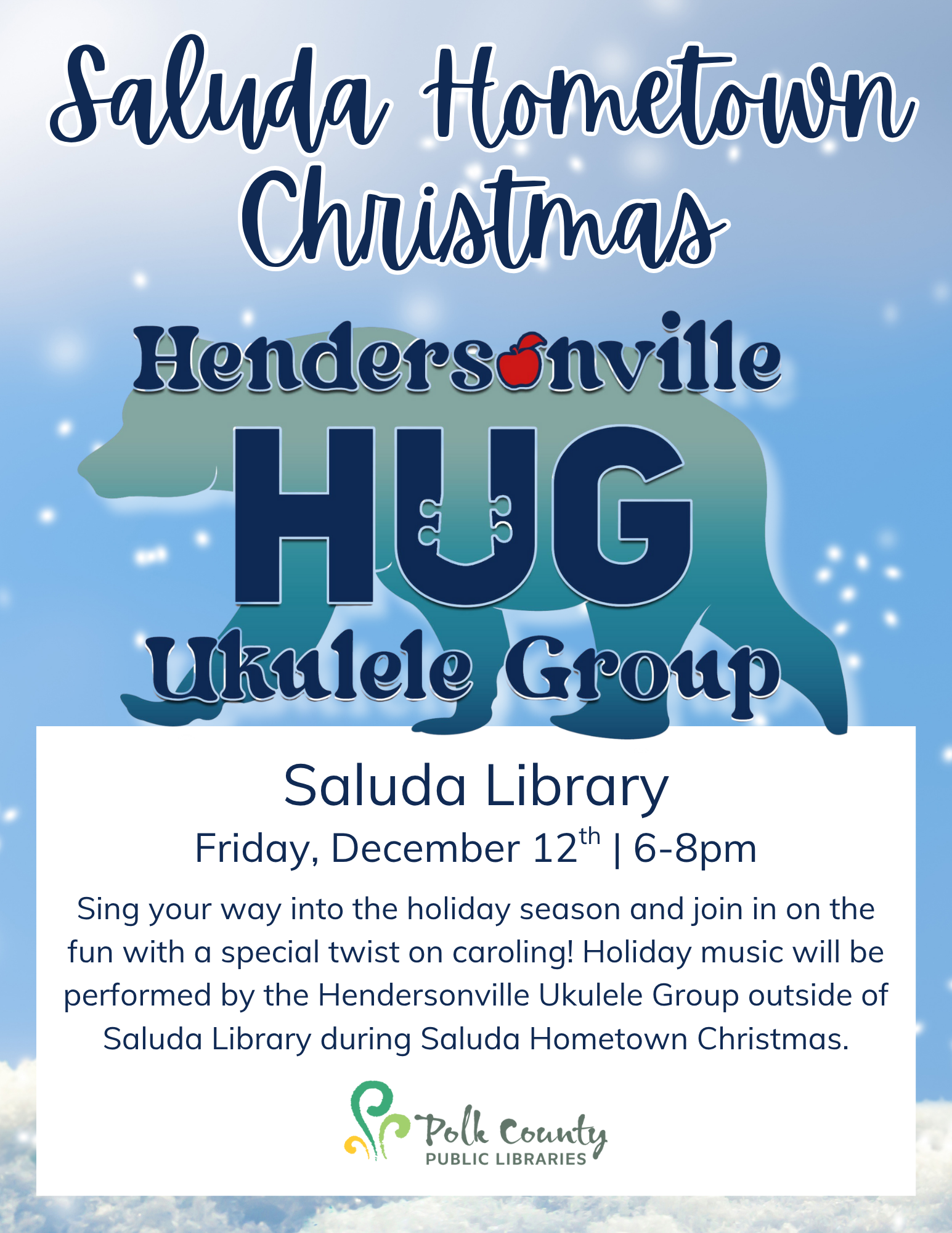 Hendersonville Ukulele Group 12/12/2025 , 6:00 PM at PCPL Saluda Hendersonville Ukulele Group @ Saluda Hometown Christmas Sing your way into the holiday season and join in on the fun with a special twist on caroling! Holiday music will be performed by the Hendersonville Ukulele Group outside of Saluda Library during Saluda Hometown Christmas.