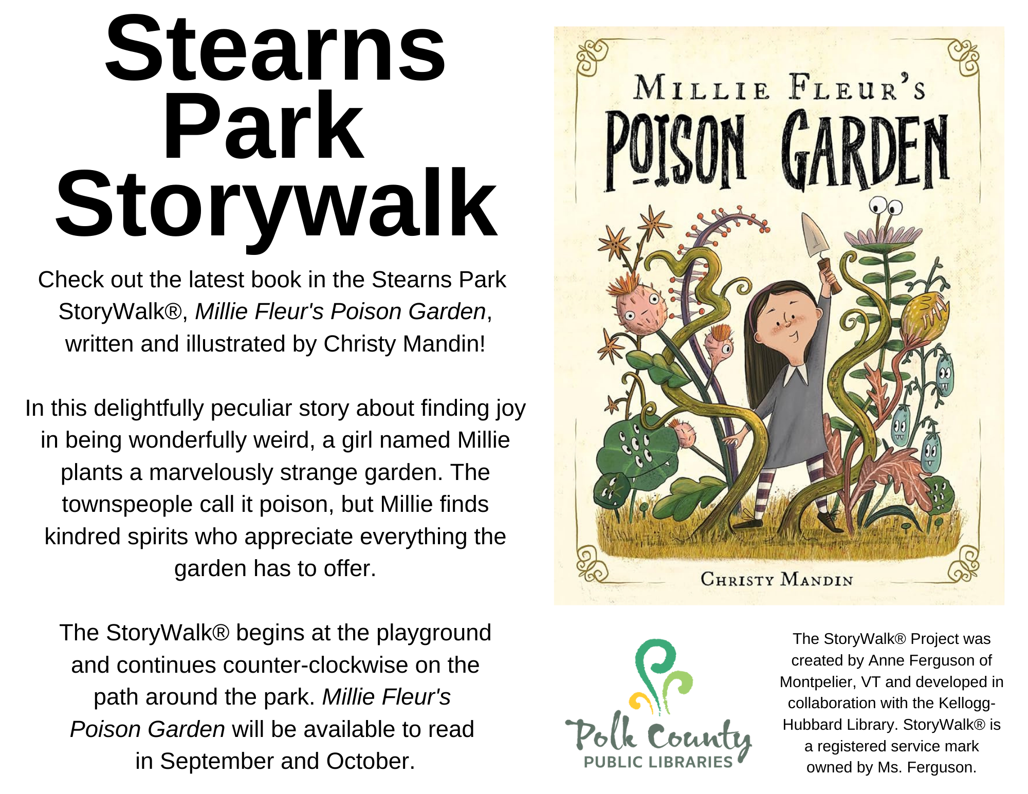 Stearns Park Storywalk 09/02/2025 , 12:00 AM at Stearns Park Check out the latest book in the Stearns Park StoryWalk®, Millie Fleur's Poison Garden, written and illustrated by Christy Mandin! In this delightfully peculiar story about finding joy in being wonderfully weird, a girl named Millie plants a marvelously strange garden. The townspeople call it poison, but Millie finds kindred spirits who appreciate everything the garden has to offer. The StoryWalk® begins at the playground and continues counter-clockwise on the path around the park. Millie Fleur's Poison Garden will be available to read in September and October. The StoryWalk® Project was created by Anne Ferguson of Montpelier, VT and developed in collaboration with the Kellogg-Hubbard Library. StoryWalk® is a registered service mark owned by Ms. Ferguson.