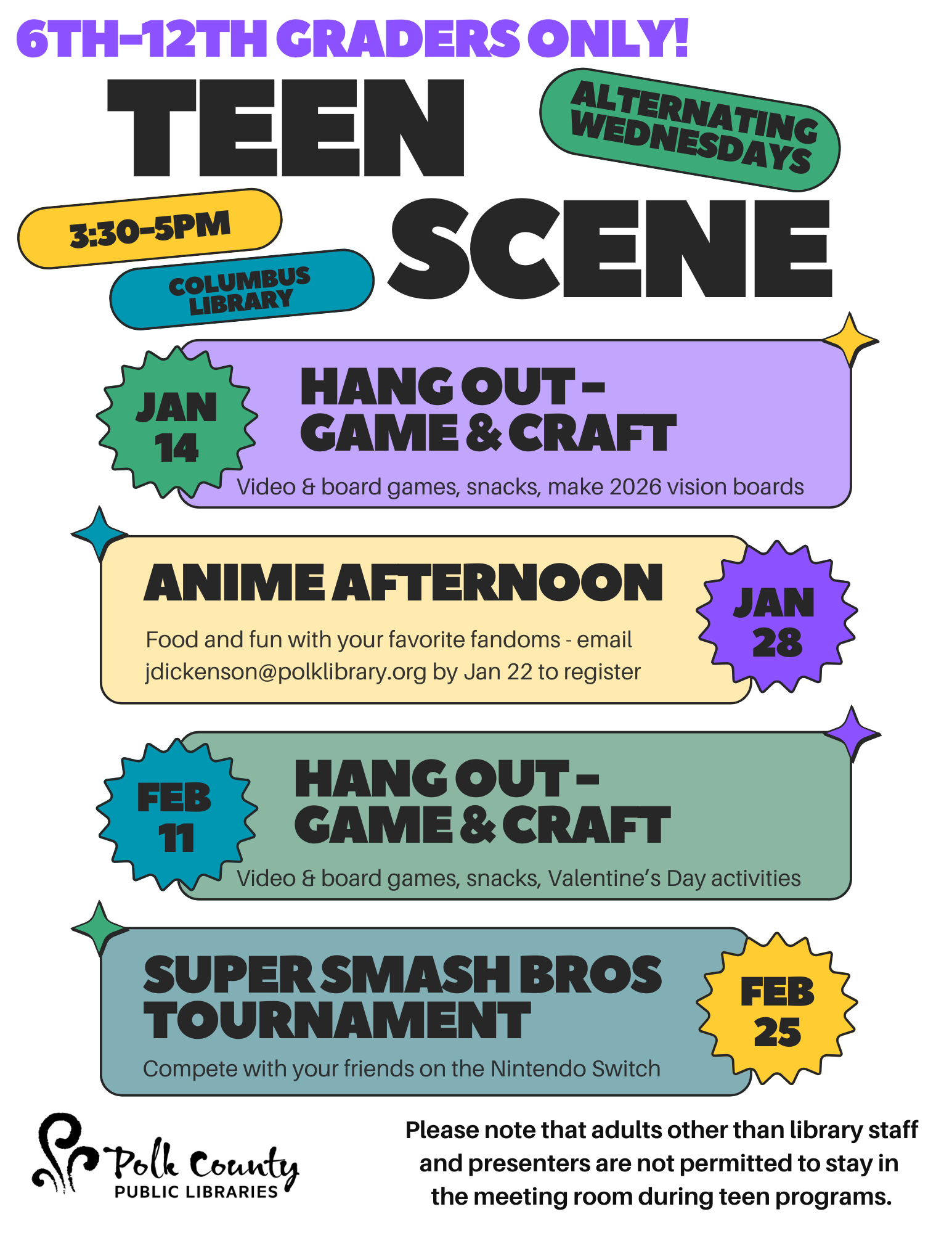 Teen Scene 01/28/2026 , 3:30 PM at PCPL Columbus Teen Scene Jan 14: Hang Out Jan 28: Anime Afternoon Feb 11: Hang Out Feb 25: Super Smash Bros Tournament Teen Scene is sponsored by the Friends of the Polk County Public Libraries! Please note that adults other than library staff, volunteers, and presenters are not permitted to stay in the meeting room during teen programs.