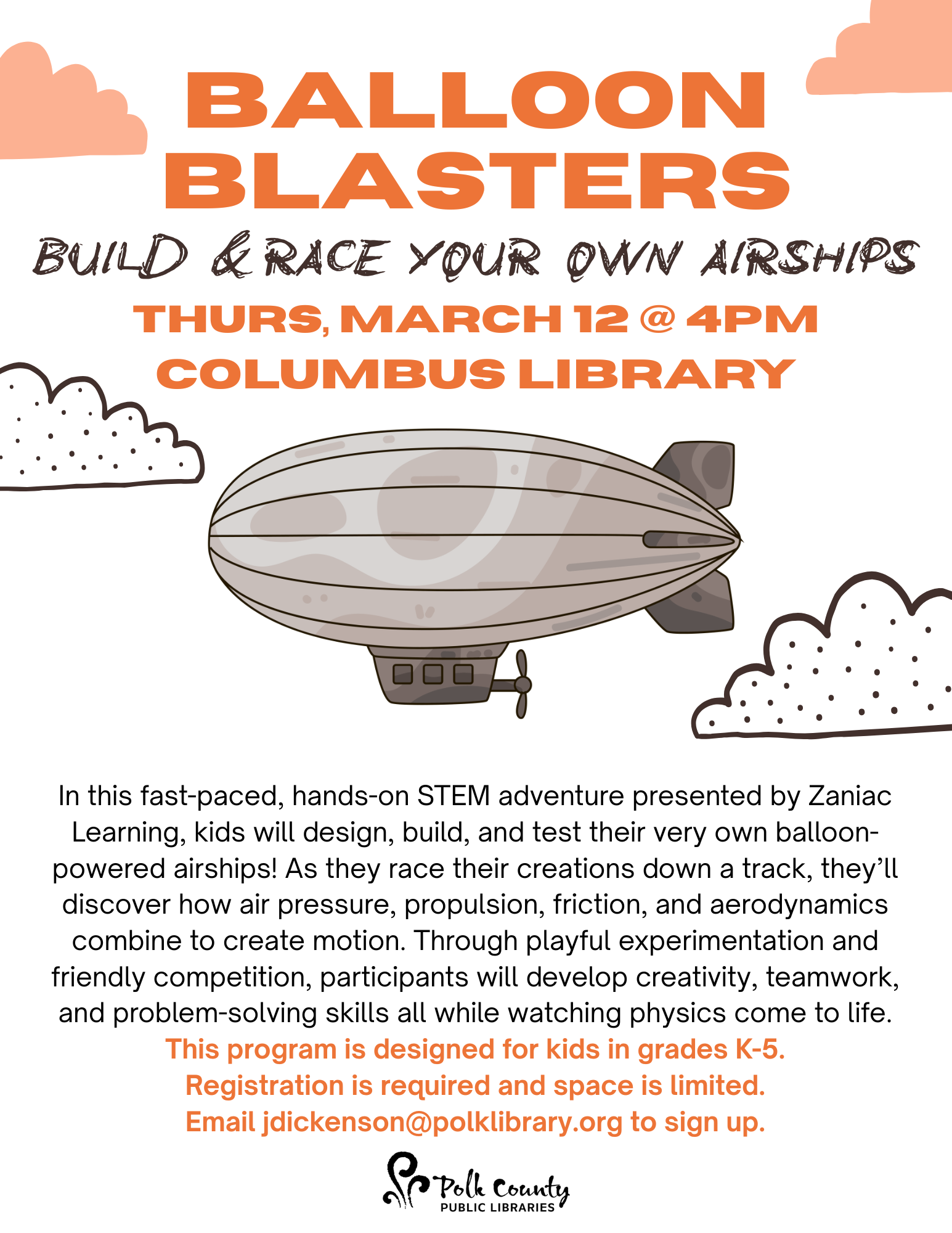 FULLY BOOKED Kids Science: Balloon Blasters 03/12/2026 , 4:00 PM at PCPL Columbus Balloon Blasters: Build & Race Your Own Airships In this fast-paced, hands-on STEM adventure for kids in grades K-5, presented by Zaniac Learning, kids will design, build, and test their very own balloon-powered airships! As they race their creations down a track, they'll discover how air pressure, propulsion, friction, and aerodynamics combine to create motion. Through playful experimentation and friendly competition, participants will develop creativity, teamwork, and problem-solving skills all while watching physics come to life. This program is now fully booked and on a waitlist. Registration is required and space is limited. Email jdickenson@polklibrary.org to sign up. Thanks to the Friends of the Polk County Public Libraries for sponsoring this program!