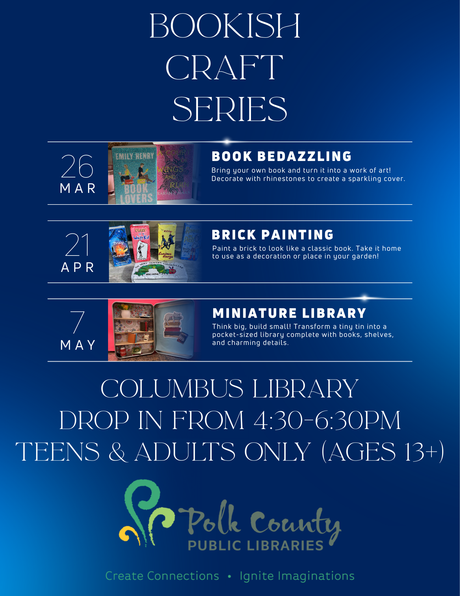 Miniature Libraries 05/07/2026 , 4:30 PM at PCPL Columbus Bookish Craft Series: Miniature Libraries Think big, build small! Transform a tiny tin into a pocket-sized library complete with books, shelves, and charming details. Drop in from 4:30-6:30pm. This program is for teens and adults only (ages 13+).