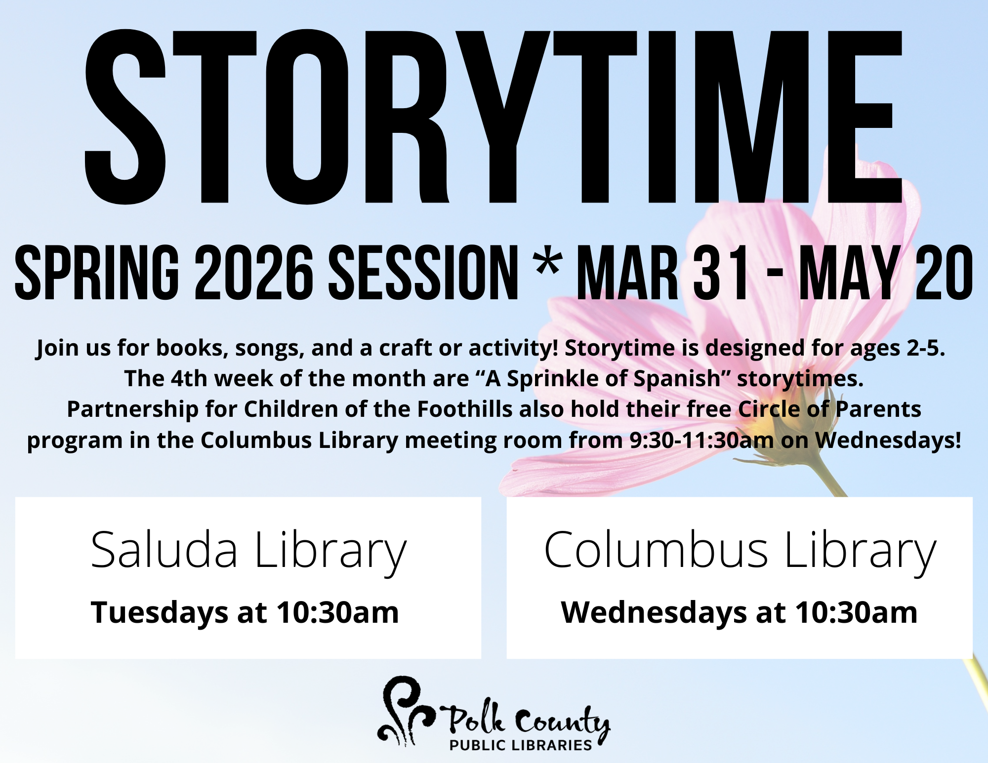 Columbus Storytime 05/13/2026 , 10:30 AM at PCPL Columbus Spring 2026 Storytime Session Join us for books, songs, and a craft or activity! Storytime is designed for ages 2-5. The 4th week of the month are "A Sprinkle of Spanish" storytimes. Partnership for Children of the Foothills also hold their free Circle of Parents program in the Columbus Library meeting room from 9-11am on Wednesdays!