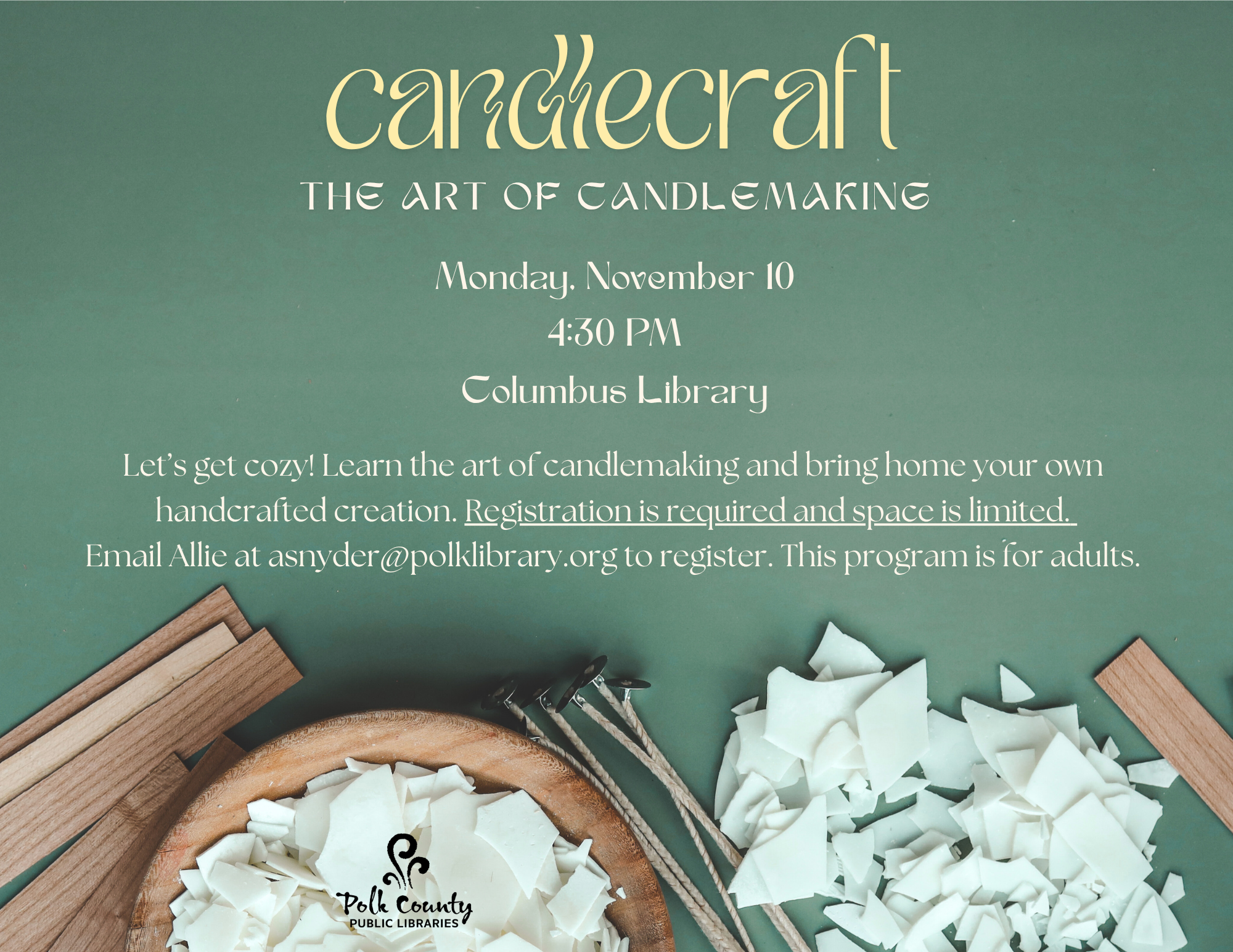 Let’s get cozy! Learn the art of candlemaking and bring home your own handcrafted creation. Registration is required and space is limited. Email Allie at asnyder@polklibrary.org to register. This program is for adults.
