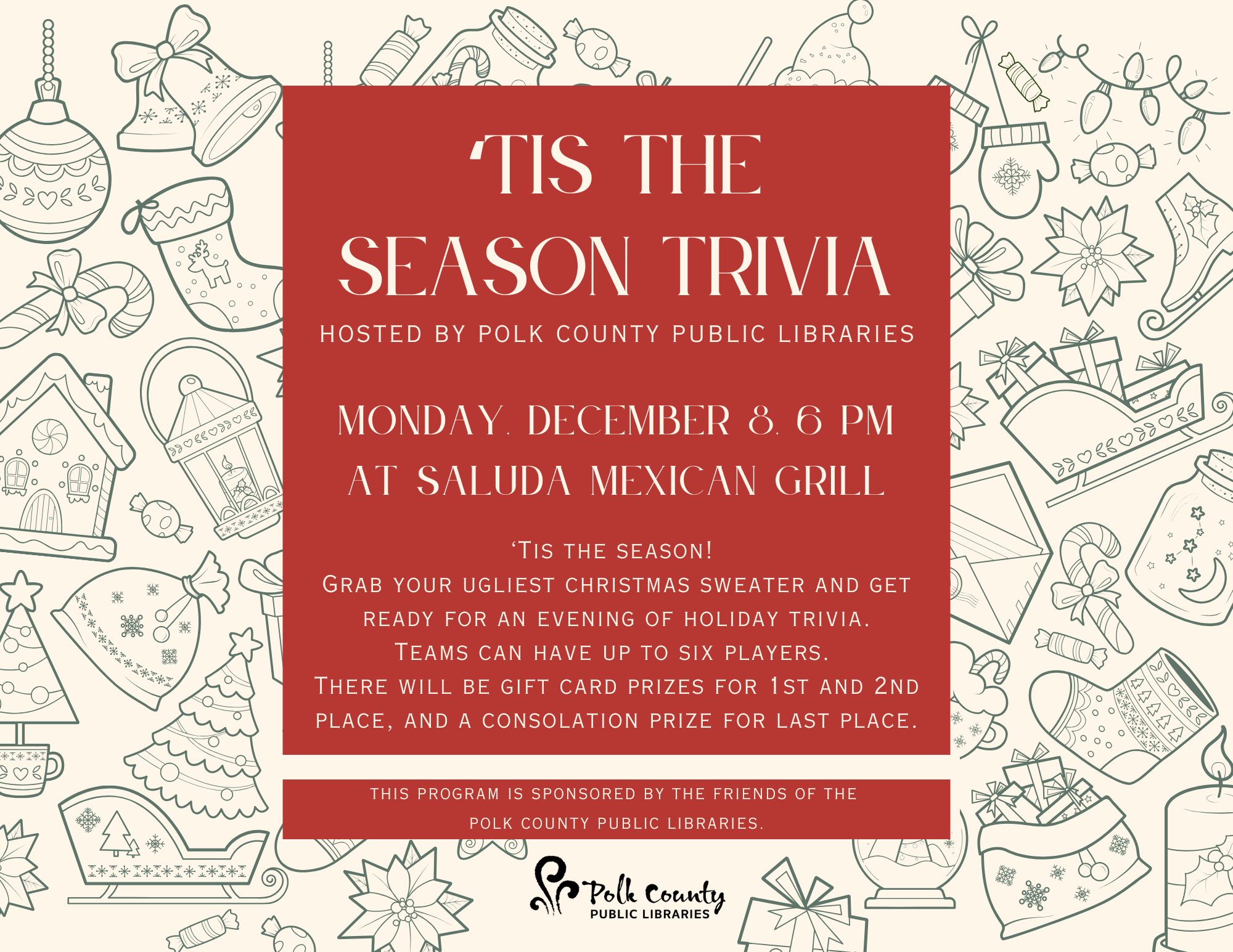 'Tis the Season Trivia 12/08/2025 , 6:00 PM at Saluda Mexican Grill ‘Tis the Season Trivia Wear your ugliest Christmas sweater and test your yuletide knowledge during an evening of holiday trivia. Teams can have up to six players. There will be gift card prizes for 1st and 2nd place, and a consolation prize for last place. This program is sponsored by the Friends of the Polk County Public Libraries.