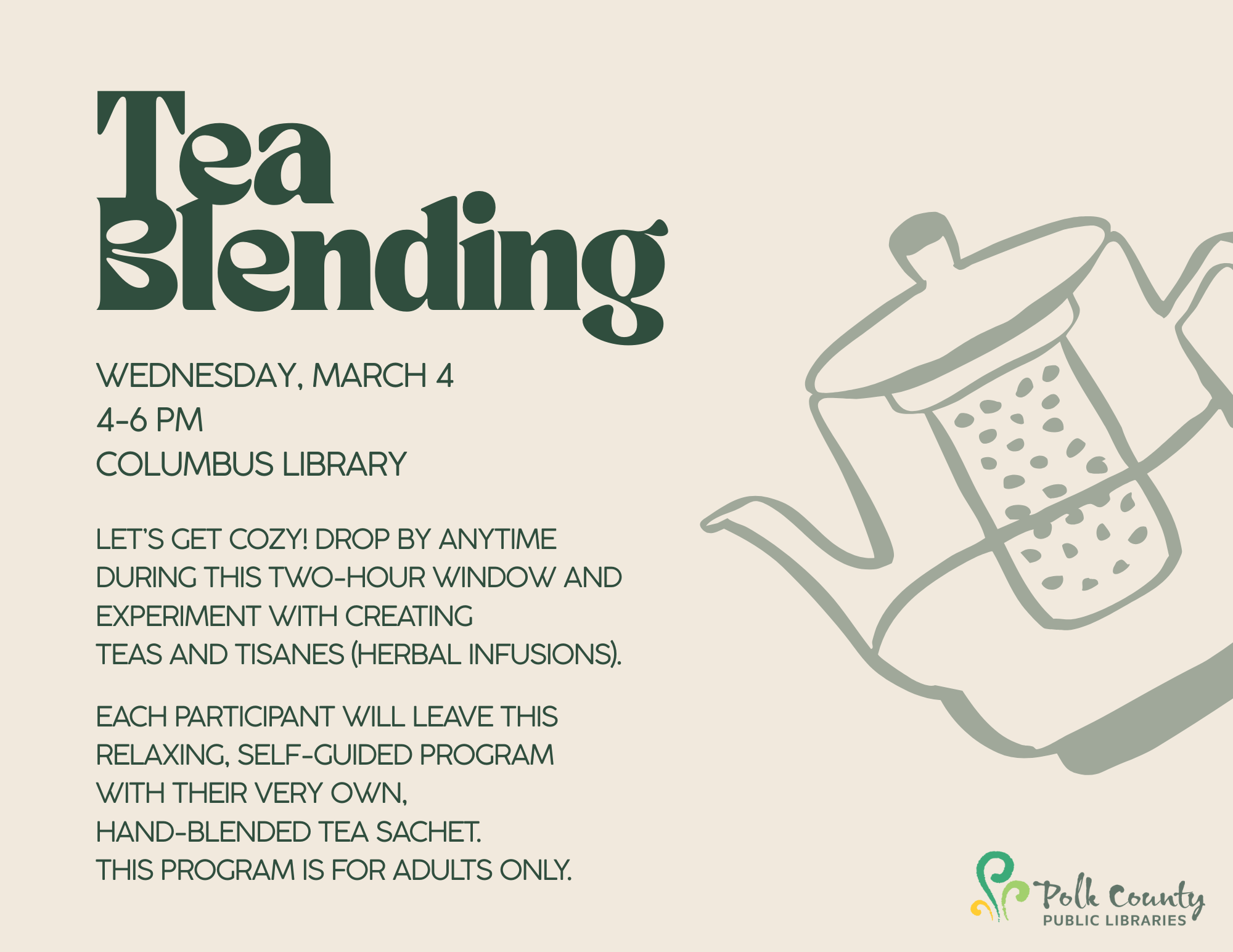 Tea Blending 03/04/2026 , 4:00 PM at PCPL Columbus Tea Blending Let’s get cozy! Drop by anytime during this two-hour window and experiment with creating teas and tisanes (herbal infusions). Each participant will leave this relaxing, self-guided program with their very own, hand-blended tea sachet. This program is for adults only and is sponsored by the Friends of the Polk County Public Libraries.