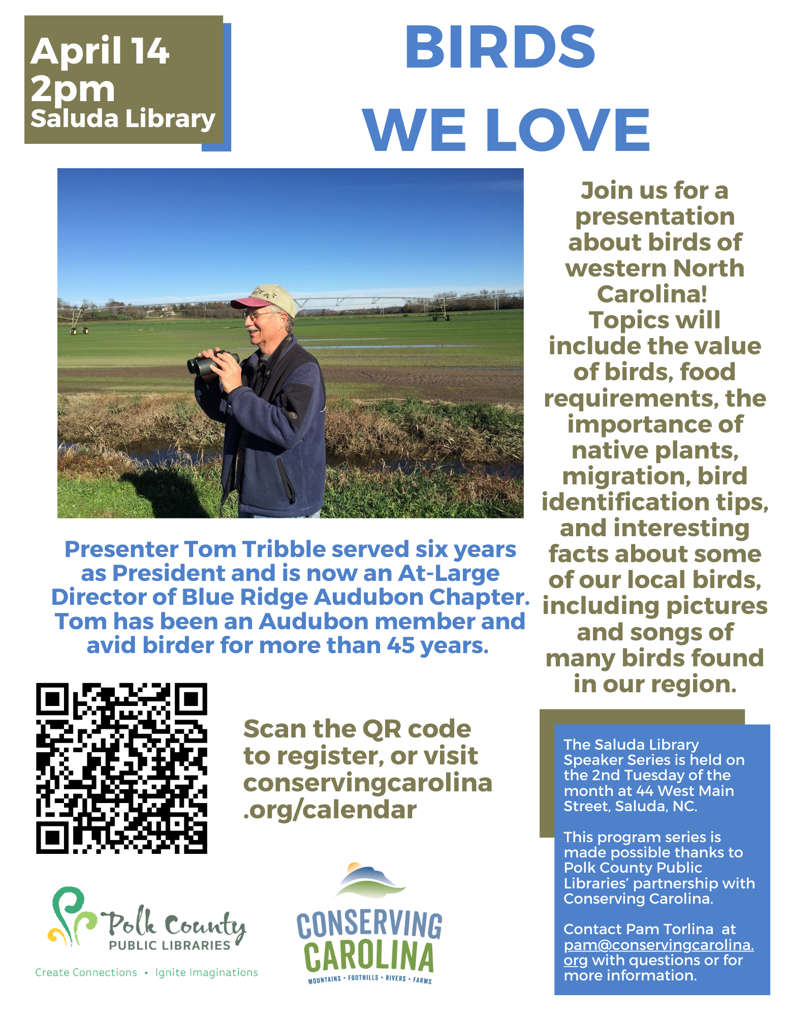 Birds We Love 04/14/2026 , 2:00 PM at PCPL Saluda Birds We Love Join us for a presentation about birds of western North Carolina! Topics will include the value of birds, food requirements, the importance of native plants, migration, bird identification tips, and interesting facts about some of our local birds, including pictures and songs of many birds found in our region. Presenter Tom Tribble served six years as President and is now an At-Large Director of Blue Ridge Audubon Chapter. Tom has been an Audubon member and avid birder for more than 45 years. Register for the program here. The Saluda Library Speaker Series is held on the 2nd Tuesday of the month at 44 West Main Street, Saluda, NC. This program series is made possible thanks to Polk County Public Libraries’ partnership with Conserving Carolina. Contact Pam Torlina at pam@conservingcarolina.org with questions or for more information.