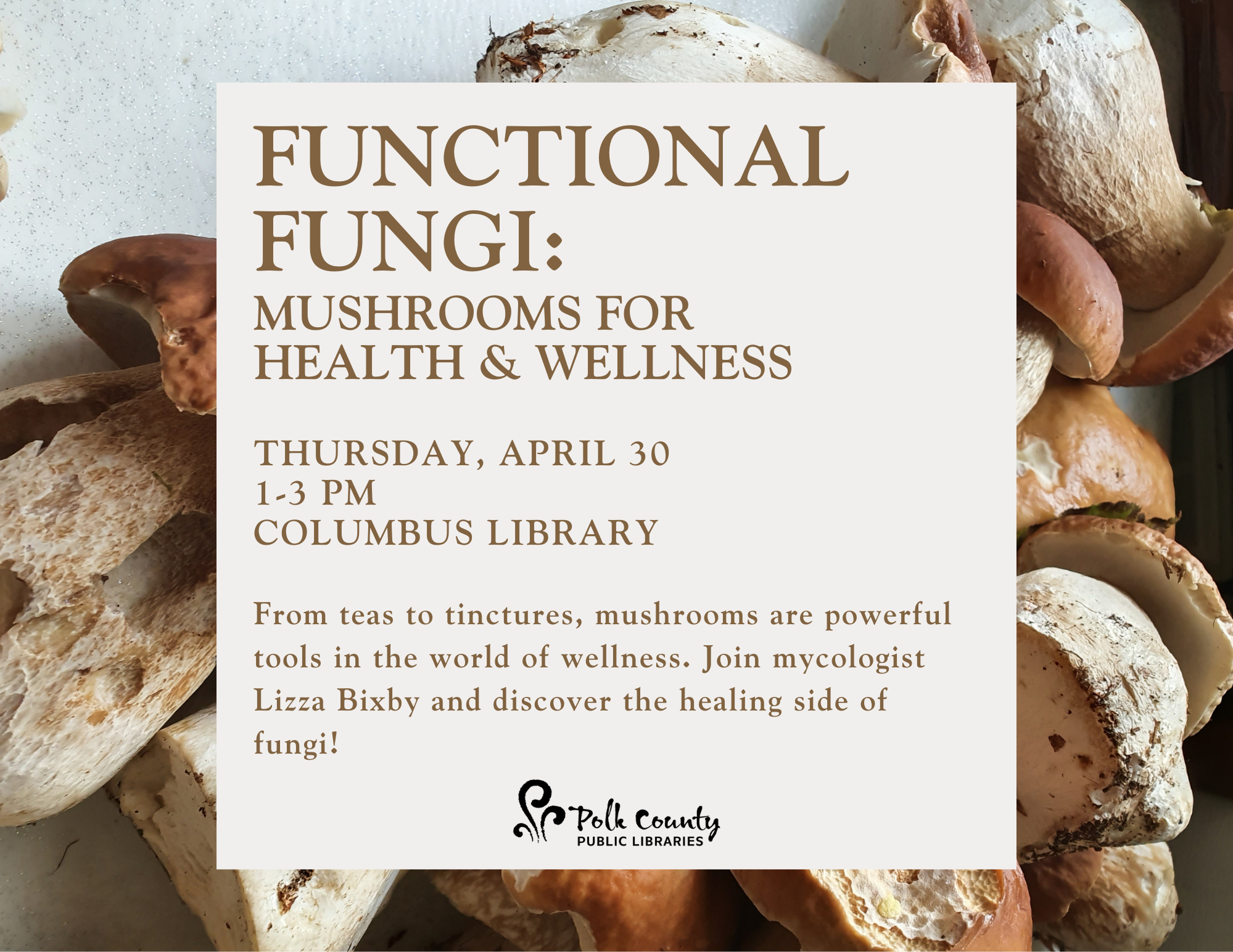 Functional Fungi 04/30/2026 , 1:00 PM at PCPL Columbus Functional Fungi From teas to tinctures, mushrooms are powerful tools in the world of wellness. Join mycologist Lizza Bixby and discover the healing side of fungi!