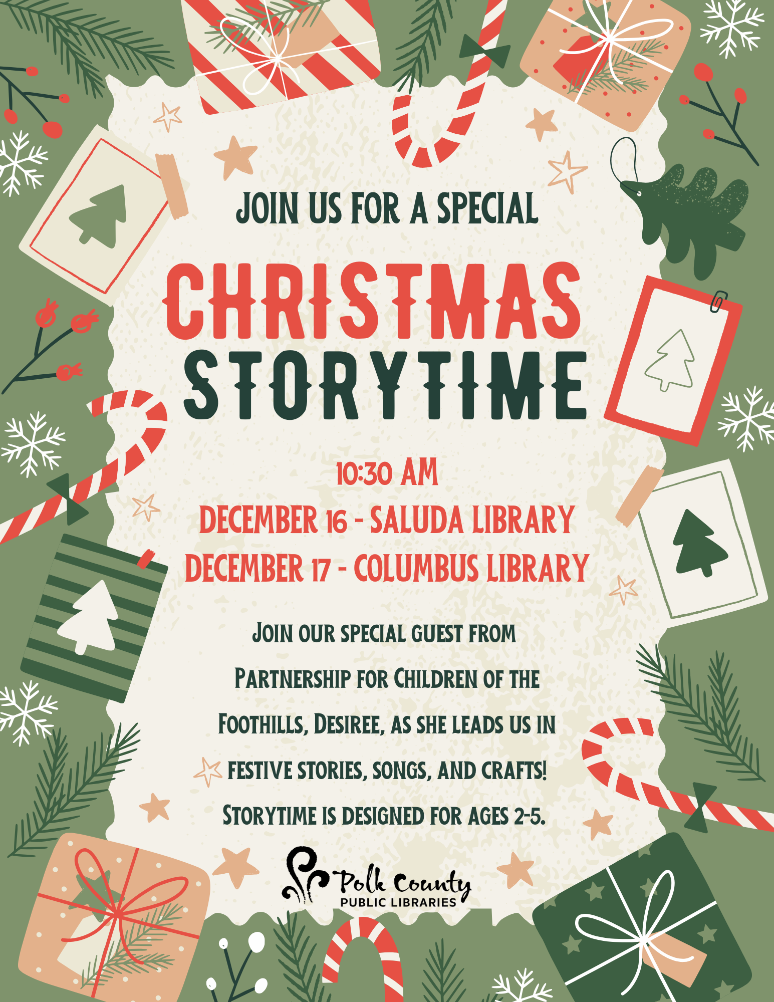 Christmas Storytime 12/16/2025 , 10:30 AM at PCPL Saluda Christmas Storytime Join our special guest from Partnership for Children of the Foothills, Desiree, as she leads us in festive stories, songs, and crafts! Storytime is designed for ages 2-5.
