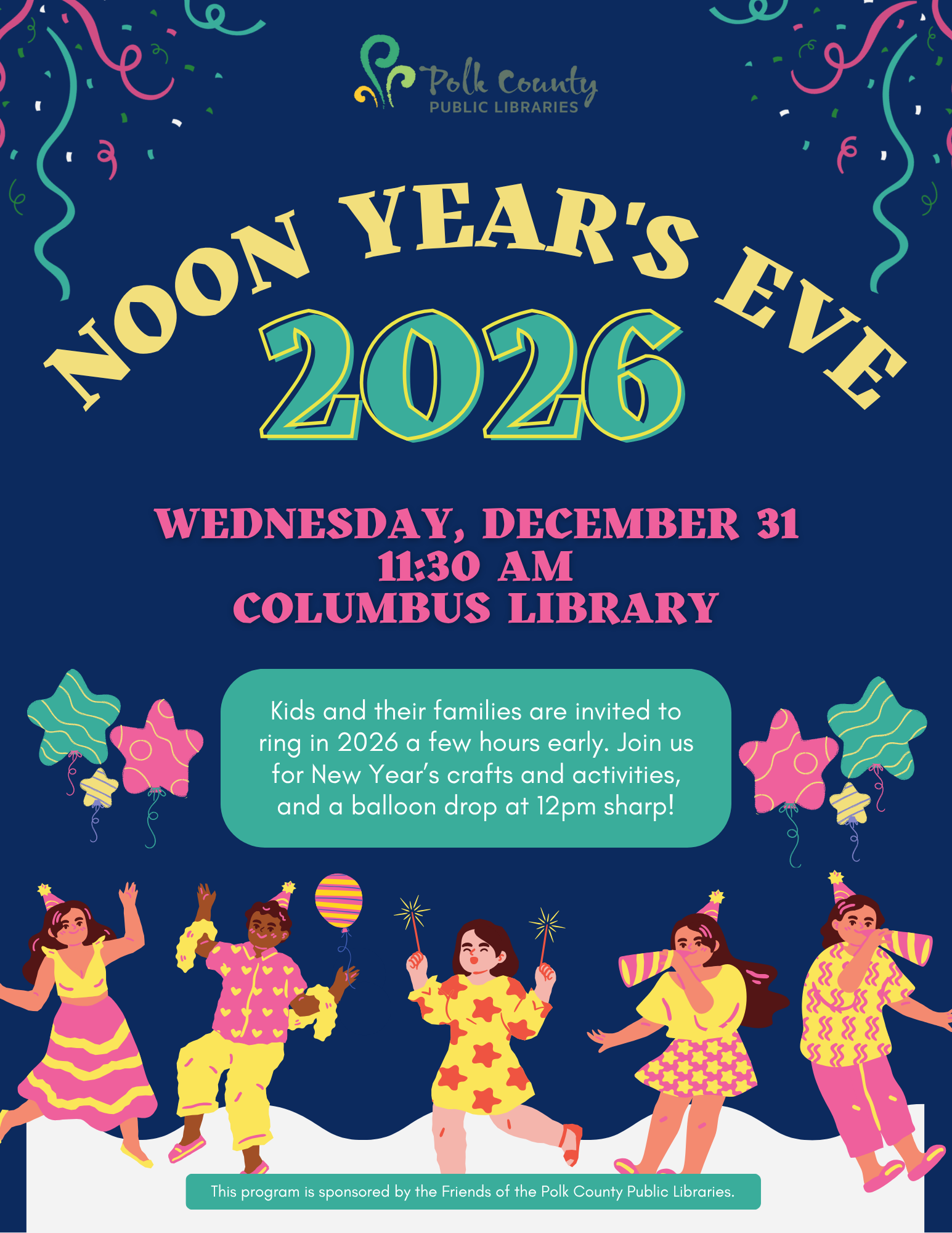 Noon Year’s Eve Party 12/31/2025 , 11:30 AM at PCPL Columbus Noon Year’s Eve Party Kids and their families are invited to ring in 2026 a few hours early. Join us for New Year’s crafts and activities, and a balloon drop at 12pm sharp! This program is sponsored by the Friends of the Polk County Public Libraries.