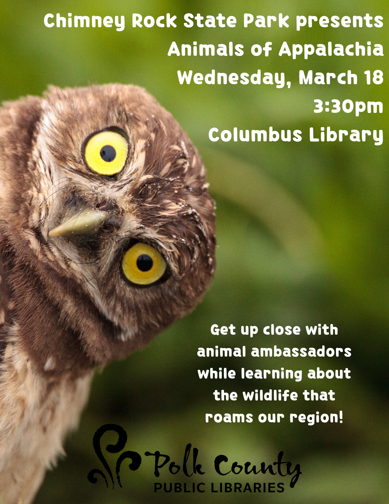 Animals of Appalachia 03/18/2026 , 3:30 PM at PCPL Columbus Chimney Rock State Park presents Animals of Appalachia Get up close with animal ambassadors while learning about the wildlife that roams our region! This program is designed for kids and their families, but all ages are welcome.