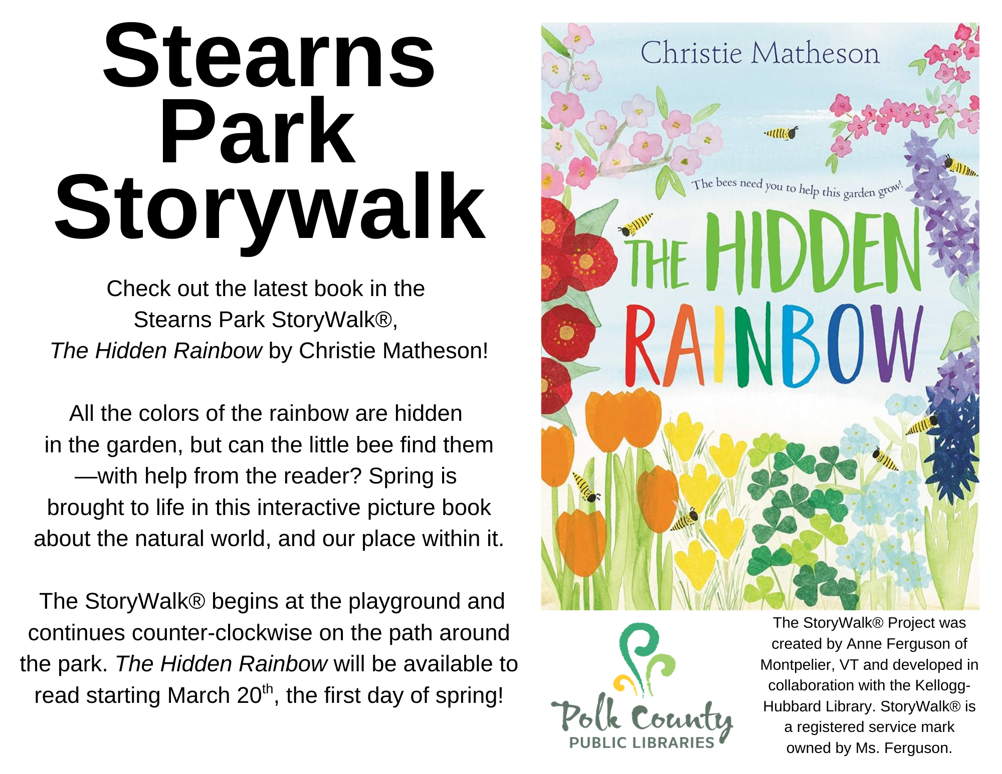 Stearns Park StoryWalk 03/20/2026 , 12:00 AM at Stearns Park Check out the latest book in the Stearns Park StoryWalk®, The Hidden Rainbow by Christie Matheson! All the colors of the rainbow are hidden in the garden, but can the little bee find them—with help from the reader? Spring is brought to life in this interactive picture book about the natural world, and our place within it. The StoryWalk® begins at the playground and continues counter-clockwise on the path around the park. The Hidden Rainbow will be available to read starting March 20th, the first day of spring!