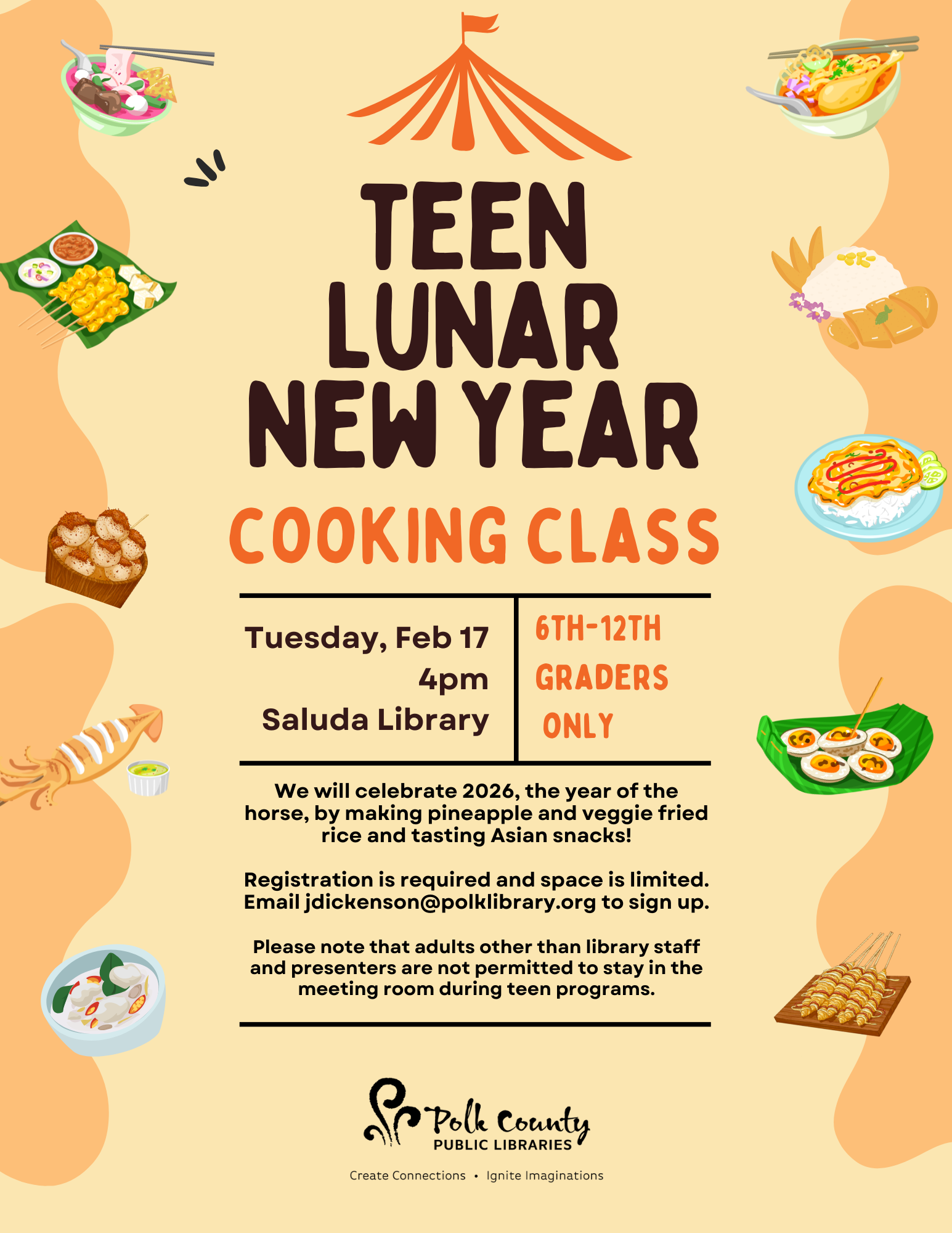 Teen Cooking Class 02/17/2026 , 4:00 PM at PCPL Saluda Teen Lunar New Year Cooking Class ***6th-12th graders only*** Thanks to the Friends of the Polk County Public Libraries for sponsoring this program!