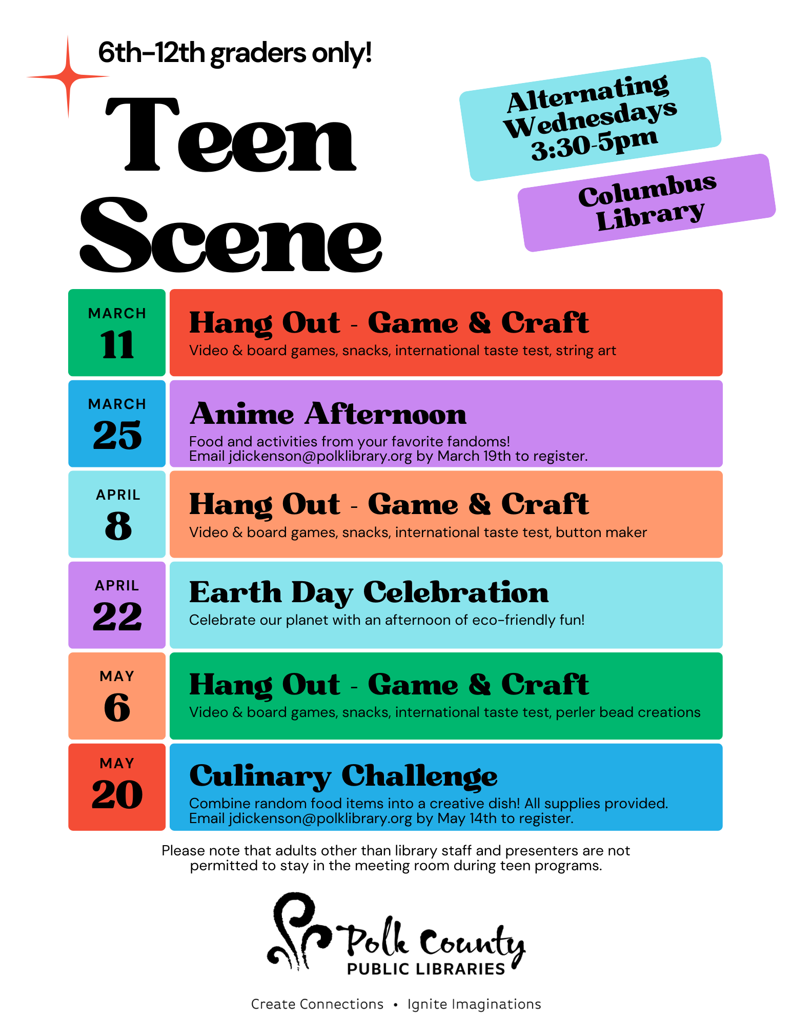Please note that adults other than library staff, volunteers, and presenters are not permitted to stay in the meeting room during teen programs.