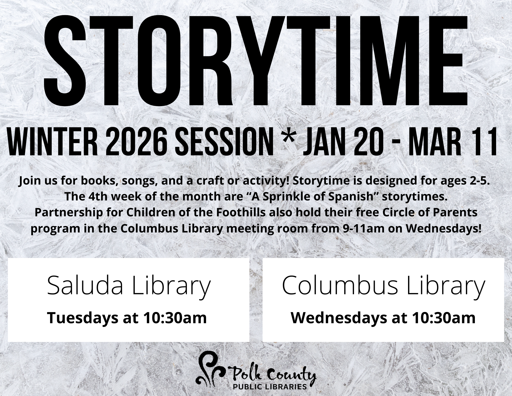 Join us for books, songs, and a craft or activity! Storytime is designed for ages 2-5. The 4th week of the month are “A Sprinkle of Spanish” storytimes. Partnership for Children of the Foothills also hold their free Circle of Parents program in the Columbus Library meeting room from 9-11am on Wednesdays!