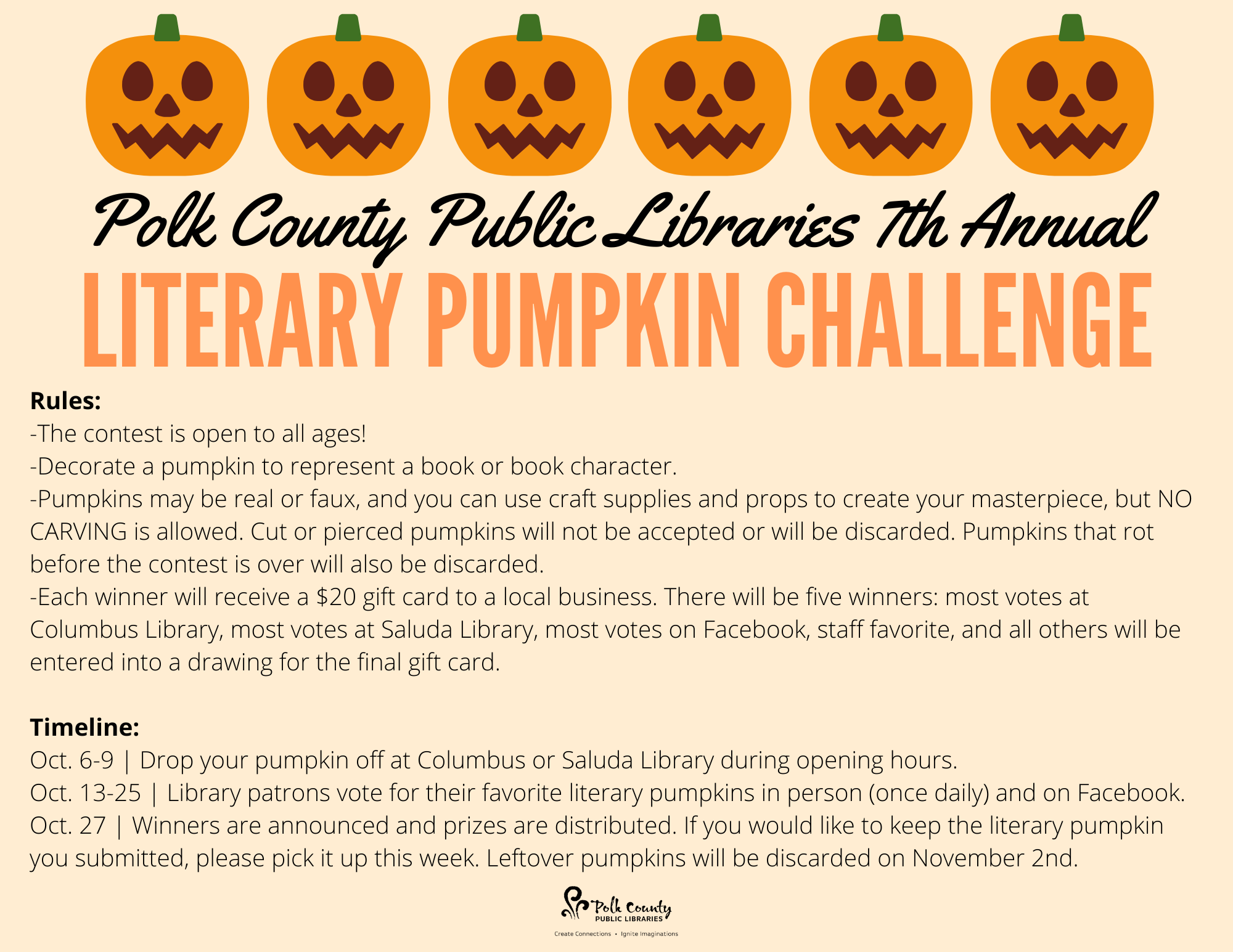 Oct. 6-9 | Drop your pumpkin off at Columbus or Saluda Library during opening hours.