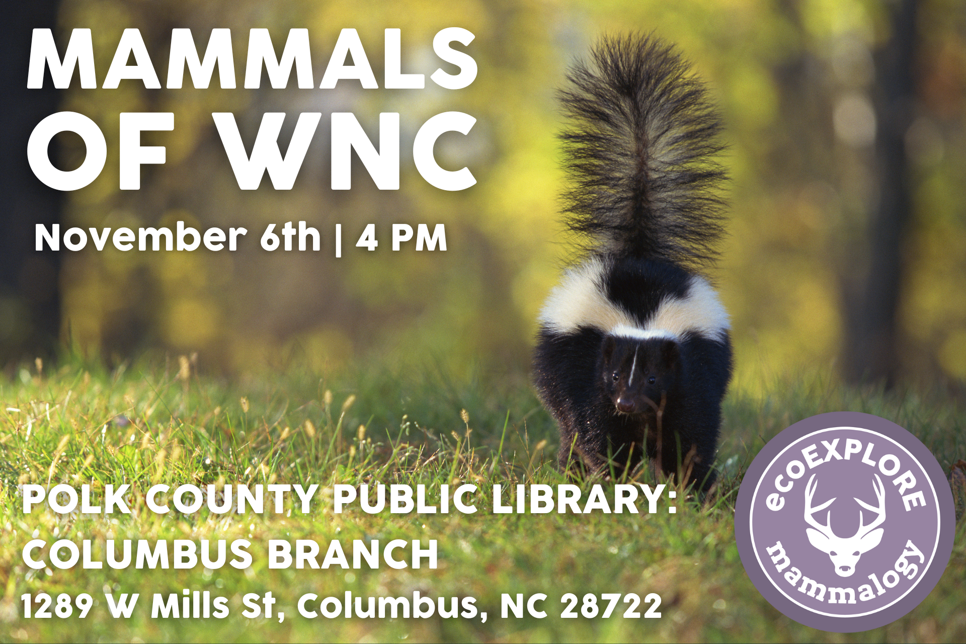 Join us for an educational program with the North Carolina Arboretum to learn all about the many different types of mammals that call Western North Carolina their home! Ever wondered why some wild mammals hibernate and some don’t? Or how to tell if a wild mammal has visited an area? At this program we’ll answer these questions and more! Come ready to hear about the ecoEXPLORE program, get up close and personal with some mammal artifacts such as skulls and skins, find out what makes a mammal a mammal, plus much more! This program is for ages 5-13.