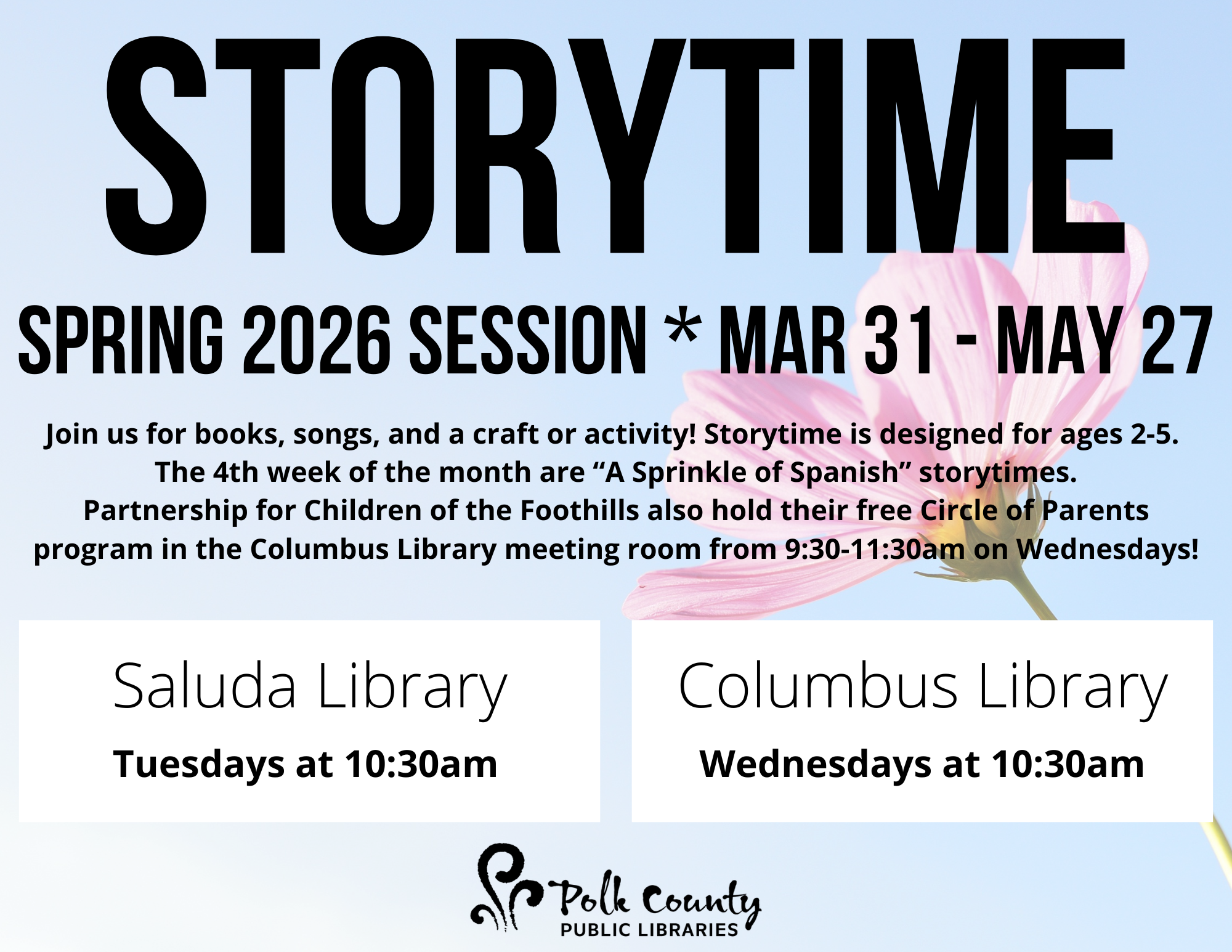 Join us for books, songs, and a craft or activity! Storytime is designed for ages 2-5. The 4th week of the month are “A Sprinkle of Spanish” storytimes. Partnership for Children of the Foothills also hold their free Circle of Parents program in the Columbus Library meeting room from 9-11am on Wednesdays!