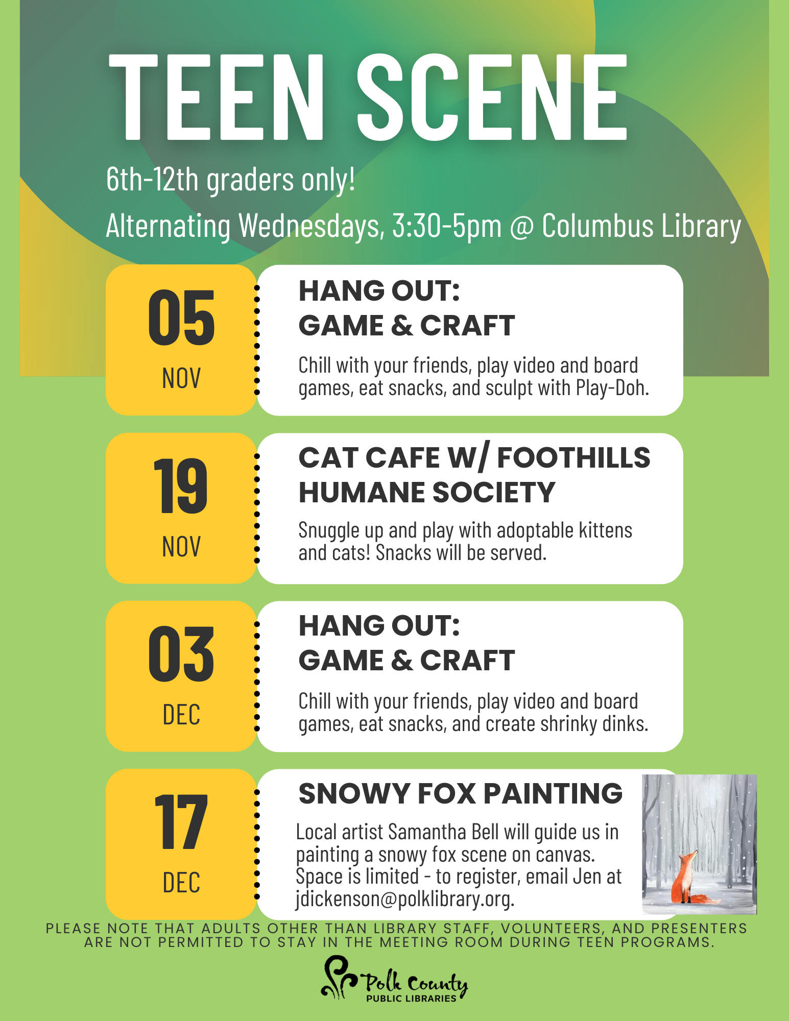 Local artist Samantha Bell will guide us in painting a snowy fox scene on canvas! Space is limited – to register, email Jen at jdickenson@polklibrary.org.