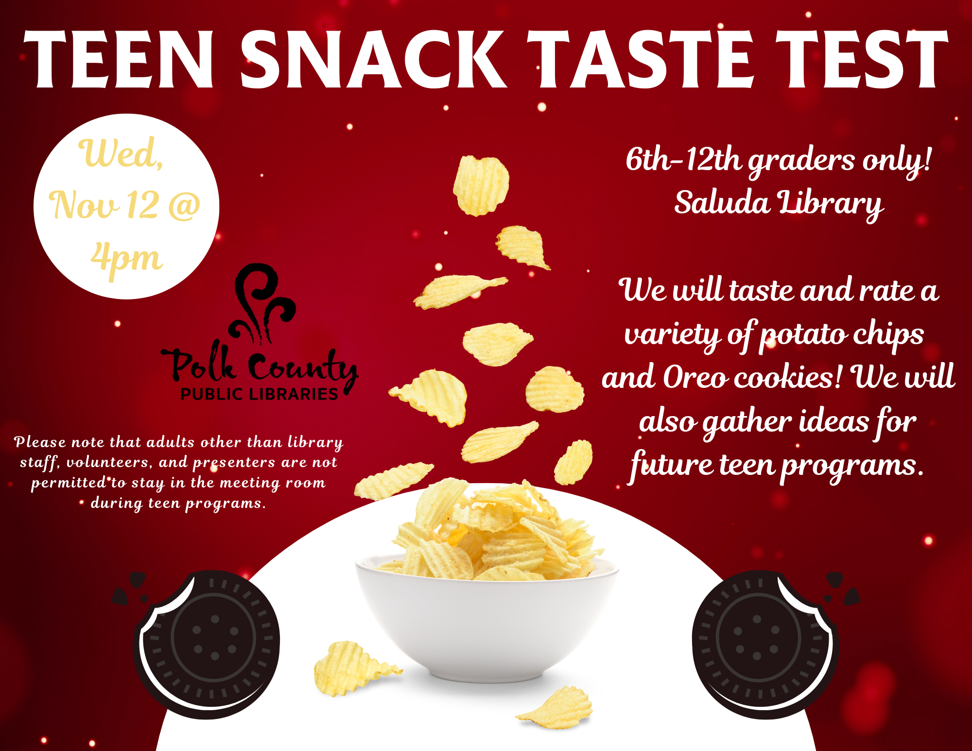 6th-12th graders only! We will taste and rate a variety of potato chips and Oreo cookies! We will also gather ideas for future teen programs. Please note that adults other than library staff, volunteers, and presenters are not permitted to stay in the meeting room during teen programs.